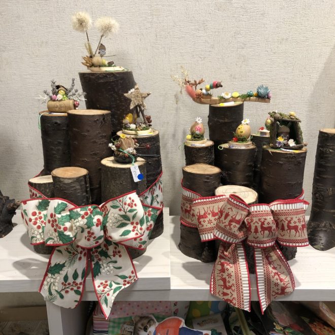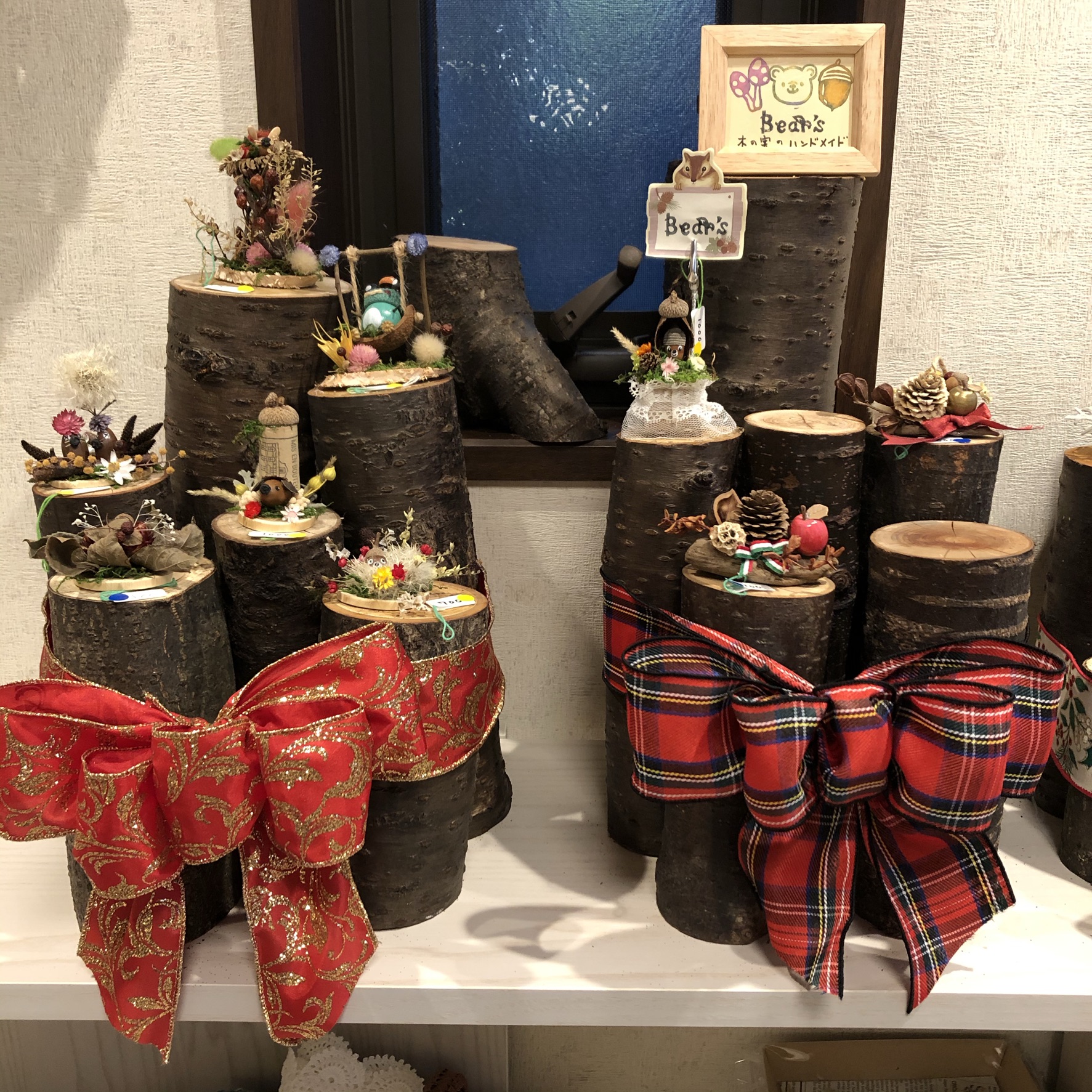桜の原木をクリスマスのリボンで結んでディスプレイ台にしました。どんぐりさん達喜んでくれるといいな