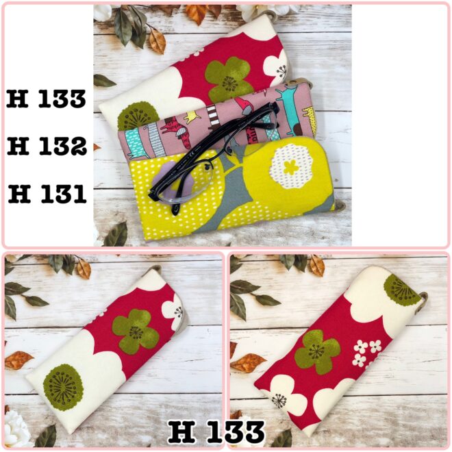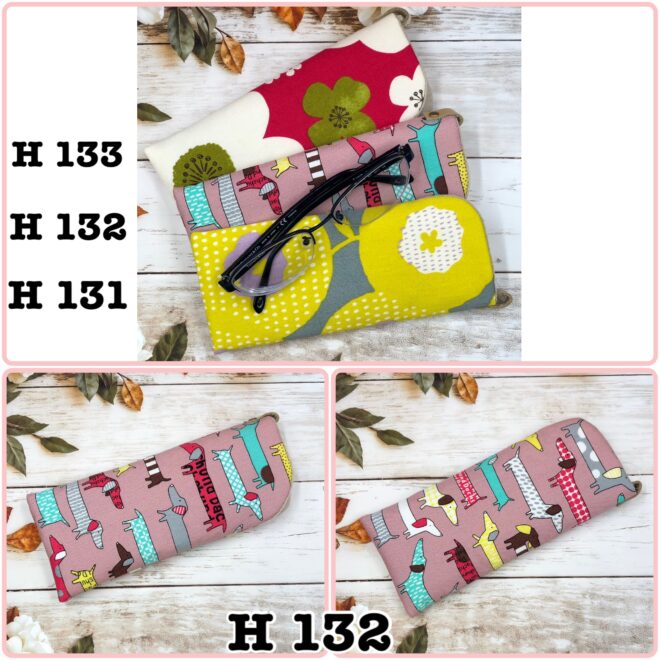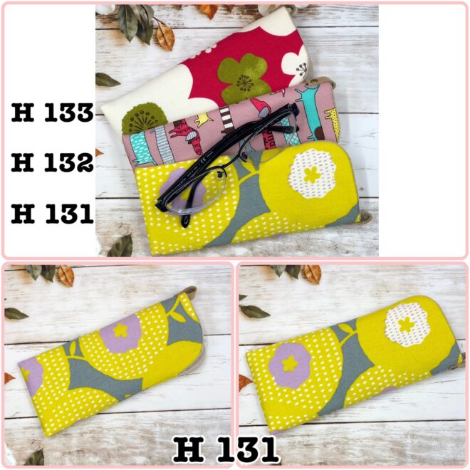 ◆ メガネケース 各 ¥550 サイズ・・・長さ 18㎝/幅 8㎝ H 131 イエロー 花 H 132 ピンク地×犬 H 133 赤地×花